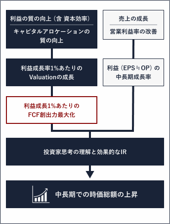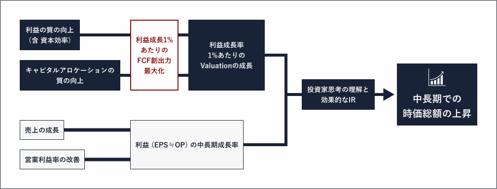 時価総額拡大の最重要ドライバーは、中⾧期的な利益の成⾧とその利益成⾧あたりのFCF創出力(=利益成⾧1%あたりのValuation)の最大化であるとCGSでは考えます。